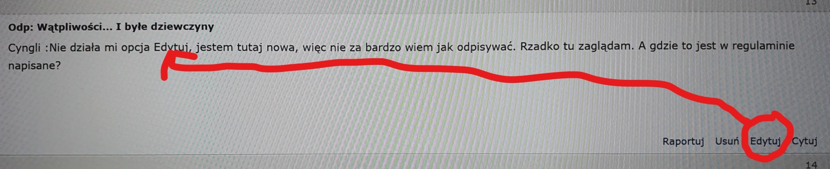 Cyngli :Nie działa mi opcja Edytuj, jestem tutaj nowa, więc nie za bardzo wiem jak odpisywać. Rzadko tu zaglądam. A gdzie to jest w regulaminie napisane?